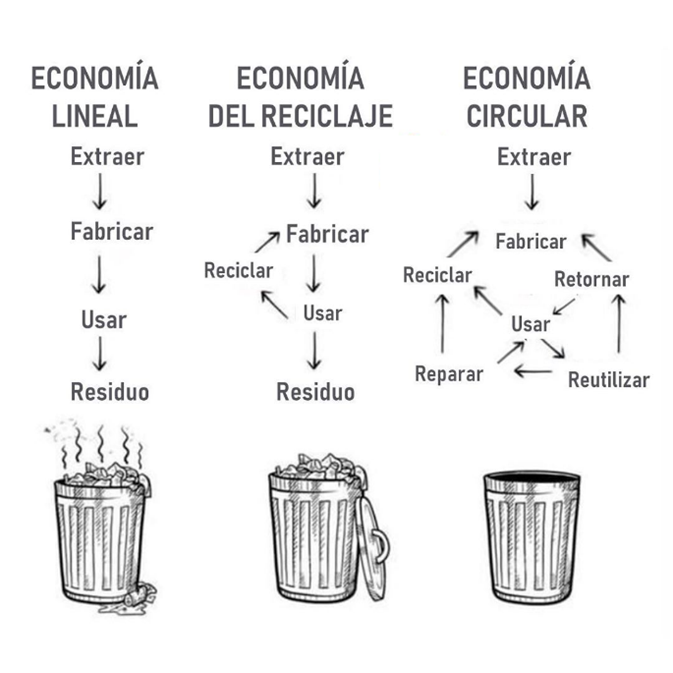 En una economia lineal los productos se producen y van directamente a la basura después de ser utilizados, esto ne es lo ideal para el medio ambiente, ya que desperdicia recursos y no reutiliza los que ya se han producido. En una economía de reciclaje, los productos se reciclan después de su uso, pero al final se tiran, esto no es mejor, porque los residuos minimizan, pero se siguen generando. Por último, la economía circular permite reutilizar los productos más de una vez e idealmente para siempre. En una economia circular se genera poco o ningún residuo porque todo se reutiliza, se recicla o se repara.