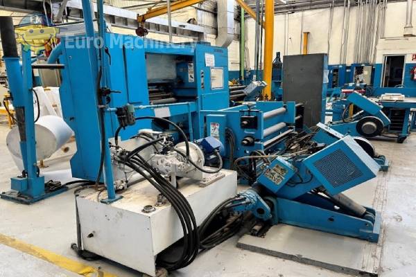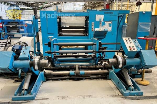 GOEBEL Cortadora rebobinadora Polyslit para cortar aluminio, film y papel. Esta cortadora rebobinadora puede cortar de 50 mm a 800 mm, velocidad de trabajo 800 m/min. Marca y modelo: GOEBEL POLYSLIT Material a cortar: Aluminio, película, papel Anchura de corte: mín. 50 mm – máx. 800 mm Espesor mín-máx: 0,009 – 0,051 mm Desbobinadora:- Diámetro máximo del rollo 1.100 mm