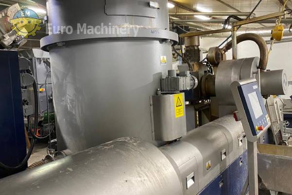 Granuladora de plástico INTAREMA 1108 TVEplus con doble desgasificación y filtro continuo láser. Línea de reciclaje Intarema para procesar PE, PP y tornillo de 80 mm de diámetro, producción de hasta 450 Kg/h. Marca & Modelo: EREMA Intarema 1108 TVEplus LF Material a procesar: PE, PP Diámetro husillo: 80 mm Producción: Hasta 450 kg/h, según el tipo de material y la velocidad de alimentación. Desgasificación: Doble desgasificación Cambiador de mallas antes de la desgasificación: Filtro continuo perforado con chapa láser Sistema de alimentación del material: Cinta de transporte con detector de metales Extrusora con tolva: Combinación aglomerador/ cortador-compactador-extrusora Sistema de peletización: Granulación en caliente con sistema de circulación de agua Potencia:- Voltaje: 3×400 VAC + PE