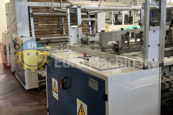 Máquina de bolsas en rollo usada para bolsas selladas Star en rollo con una anchura de sellado de hasta 1100 mm. Máquina en perfecto estado de funcionamiento puede verse en producción durante una inspección. Tipo de producción: Bolsas selladas en estrella en rollo- Bolsas de basura