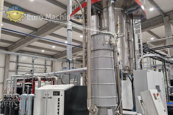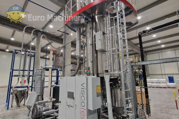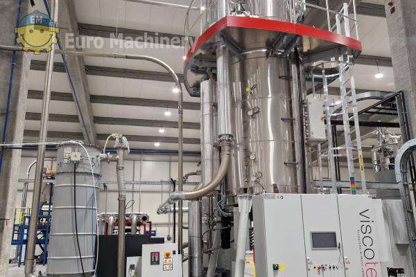 Descontaminación y secado de escamas de PET de VISCOTEC para el reciclado de PET. Equipo de reciclaje capaz de procesar escamas de botellas de PET PCR. Marca y modelo: VISCOTEC DYNAVAC deCON50 Material que se puede procesar: Escamas de botella de PET PCR Ámbitos de aplicación: Reciclado de PET Método de funcionamiento: Las escamas de PET se precalientan y se introducen al vacío en los recipientes del reactor. Con el sistema DYNAVAC, las temperaturas de ebullición del agua y los contaminantes inherentes a se reducen sustancialmente, lo que conduce a un excelente rendimiento de secado y descontaminación a temperaturas y tiempo inferiores a los requeridos habitualmente. El diseño especial de la salida del deCON50 permite un verdadero First In First Out de cada escama, garantizando un tratamiento continuo antes de que las escamas abandonen el reactor a través de una esclusa de vacío para pasar a la siguiente fase del proceso. Ventajas:- Descontaminación de los flackes PCR según la EFSA y la FDA